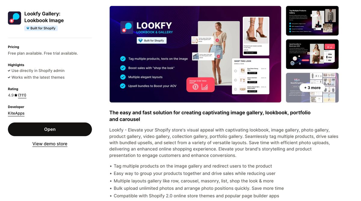 「Lookfy Gallery: Lookbook Image」は、KiteAppsが提供するShopify向けアプリで、ストアに魅力的な画像ギャラリーやルックブック、ポートフォリオ、カルーセルを簡単に作成・表示できるソリューションです。視覚的な魅力を最大限に引き出し、ブランドのストーリーテリングや商品の見せ方を進化させることで、顧客のエンゲージメント向上と売上促進を支援します。Shopifyの厳しい基準を満たしたアプリに付与される「Built for Shopify」に選ばれた信頼性の高いアプリで、評価は4.9/5(111件のレビュー)で、無料プランや無料トライアルも提供されています。