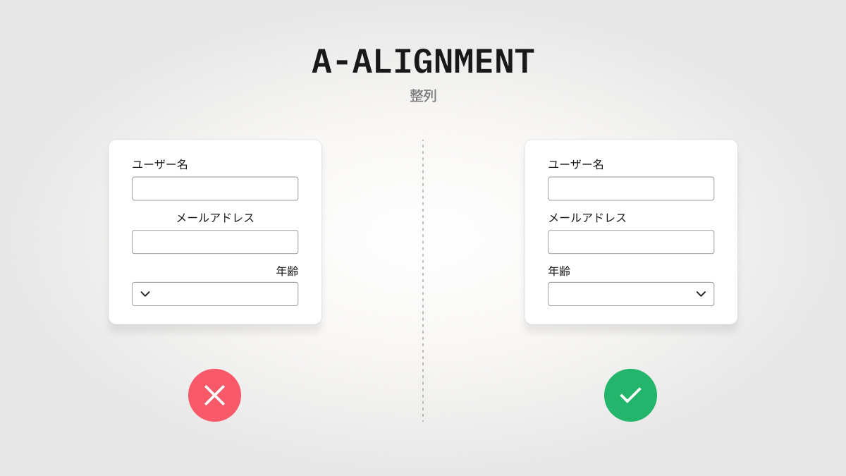 たとえば、フォームデザインにおいて、すべての入力フィールドを左揃えにすることで、ユーザーが一貫した流れで入力作業を進めやすくなります。一方、フィールドがランダムに配置されていると、視線が無駄に動き、ユーザーは混乱してしまいます。