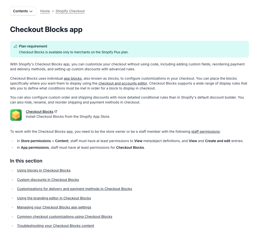 Shopify Help Centerには、Checkout Blocksの概要や設定方法に関する詳細なドキュメントが掲載されています。以下のリンクからアクセスできます。