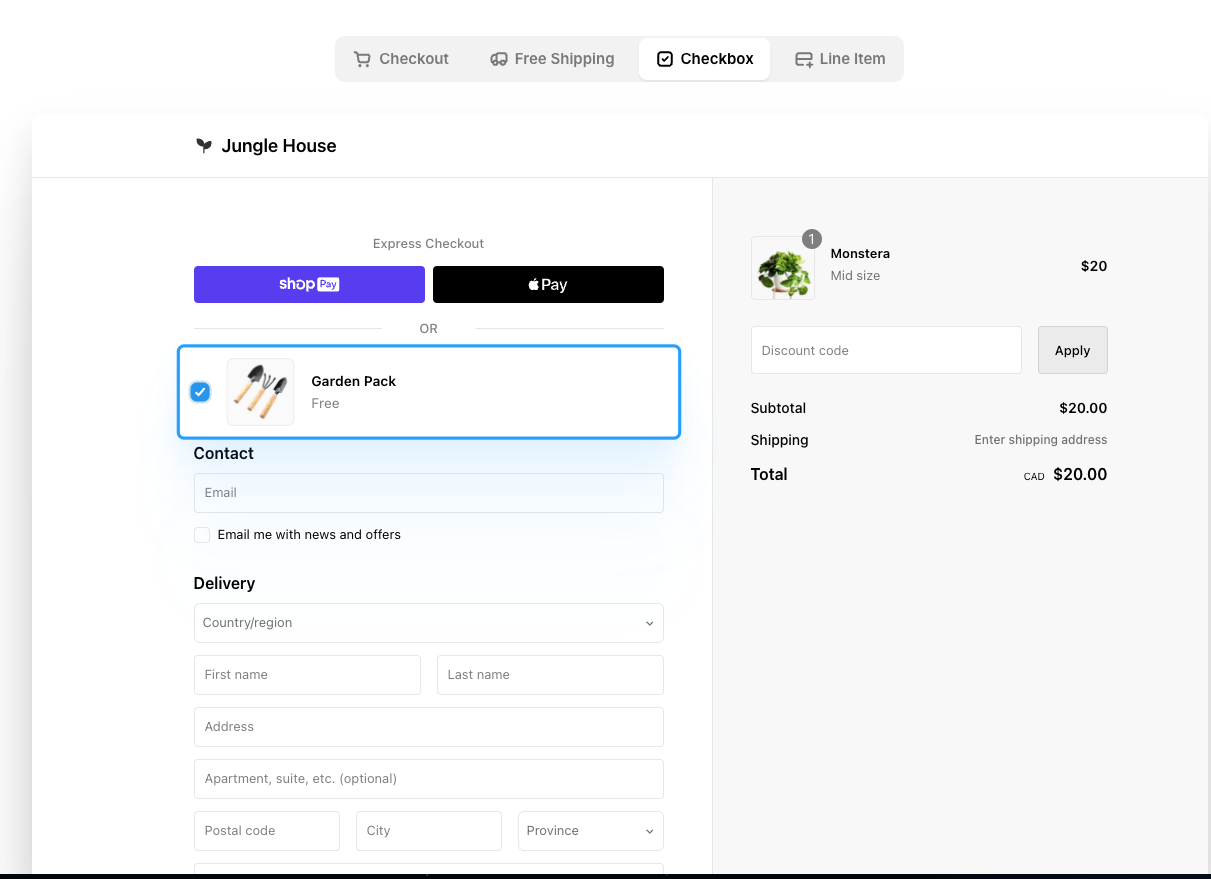 さらに、Shopify Checkout Blocksを活用することで、顧客がカゴ落ちする可能性を低減し、購入を後押しできます。例えば、購入金額に応じたカスタムディスカウントや送料無料条件を簡単に設定することで、コンバージョン率の向上が期待できます。
