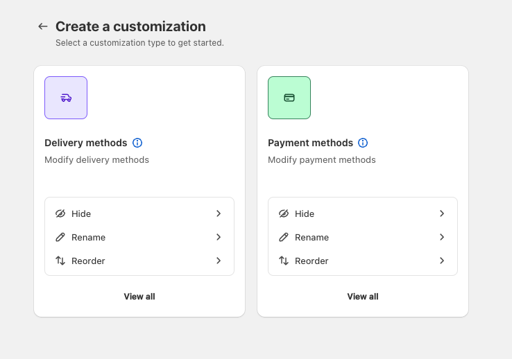 Customizationsでは、配送や決済の設定を行うことができます。