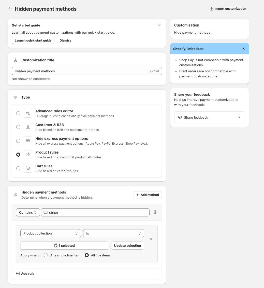 例えば成人向け商品の場合、Stripeの利用が制限されるので、ここでは成人向け商品のコレクションがカートにある場合にStripeを非表示にするルールを設定してみました。