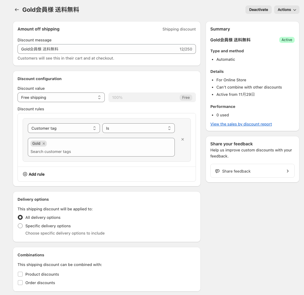 例えば何度もリピートしていただいているお客様に対してGoldタグをつけておき、そのお客様には送料無料にするなどの設定ができます。