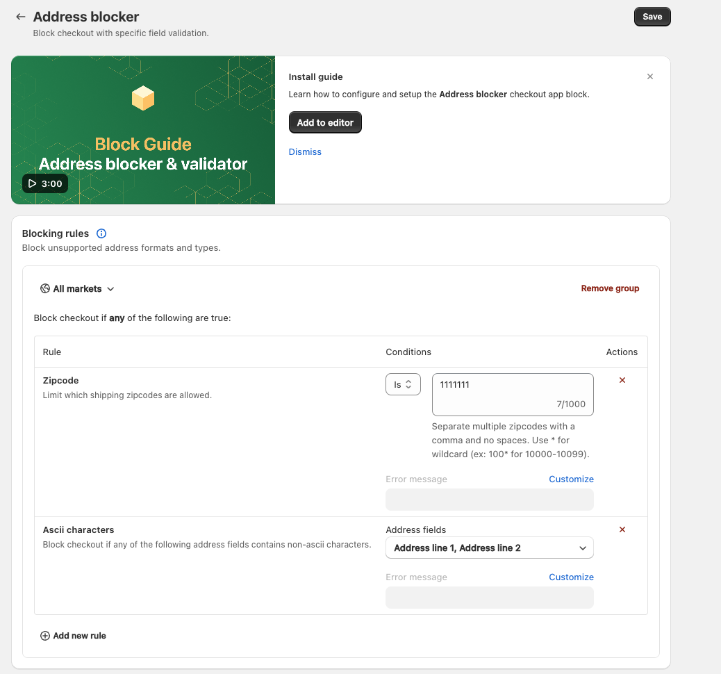 Address blockerでは特定の配送サービスに適合した住所を入力してもらうためのバリデーションを設定できるようです。 例えばAscii文字をブロックする、名前は32文字以内といったルールが設定できます。