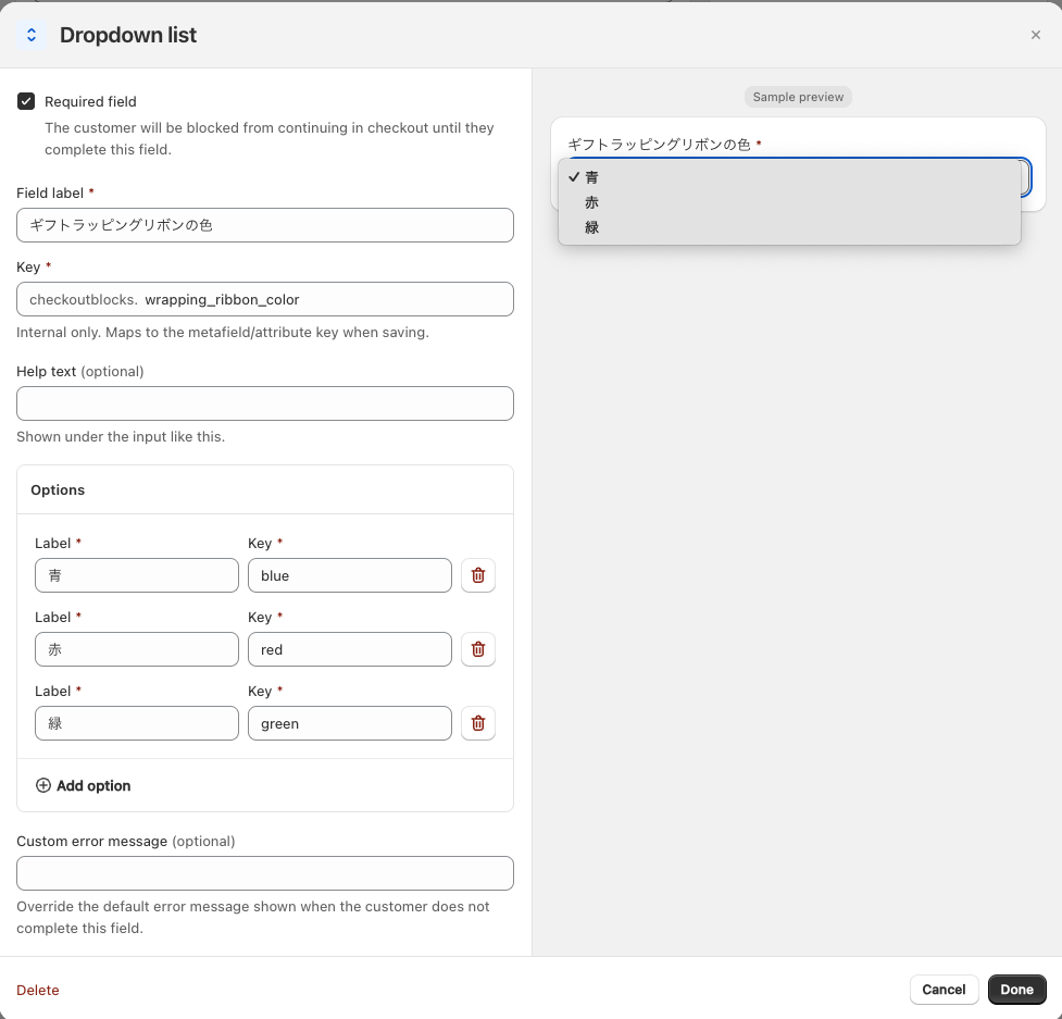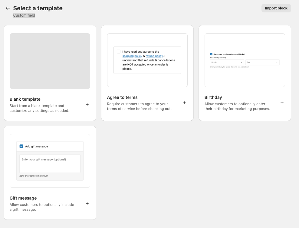 Custom fieldの作成画面では規約の同意など、ECサイトでよくあるチェックボックスといったテンプレートが用意されています。非常に便利ですね。