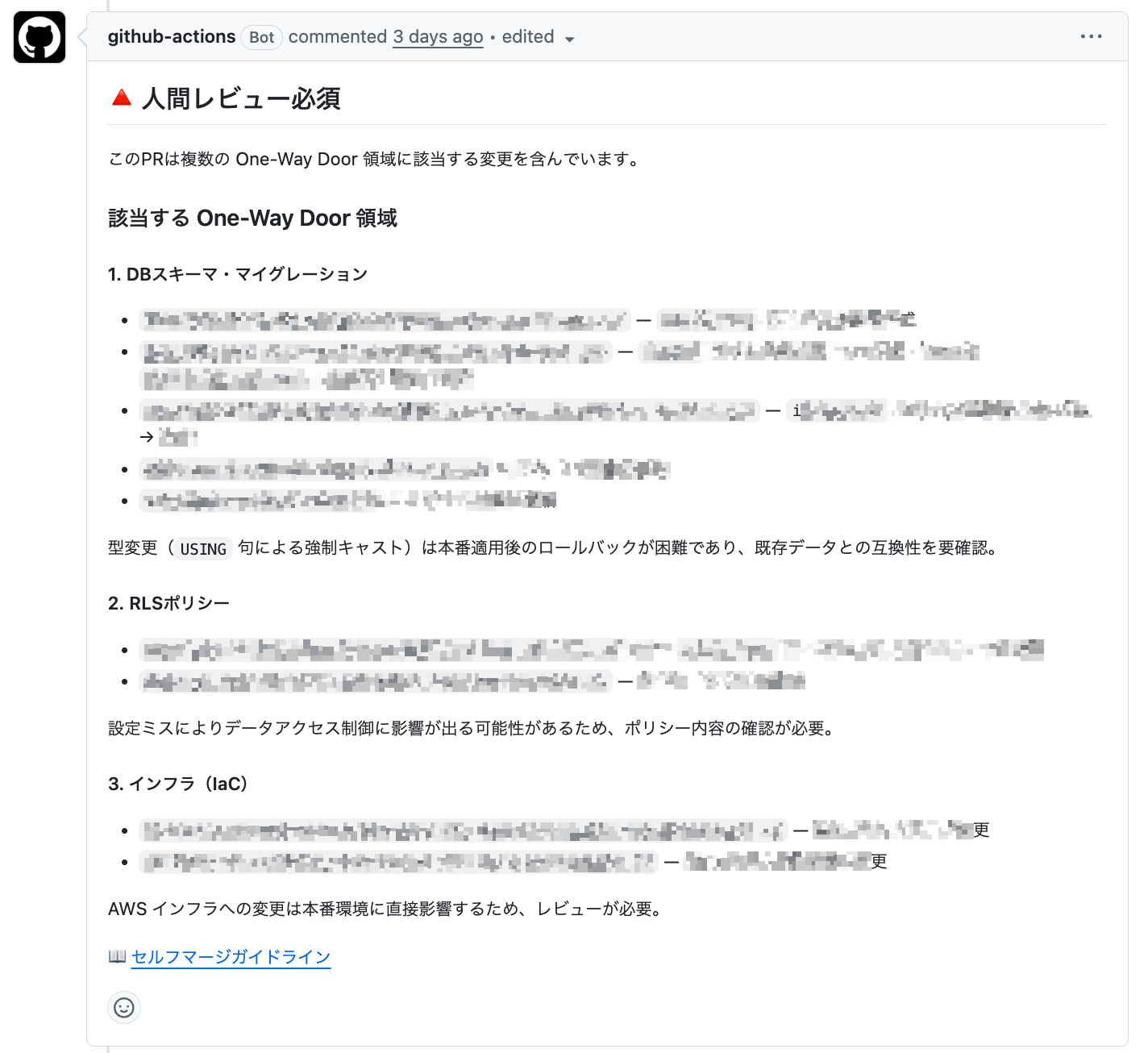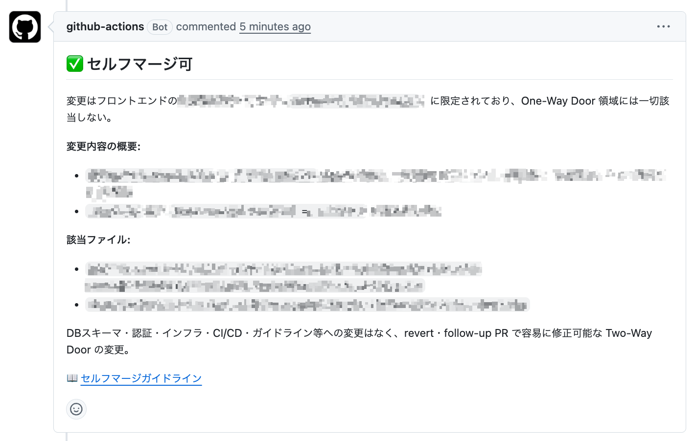 実際の判定コメントは次のような形で投稿されます。Two-Way Door な変更にはセルフマージ可、One-Way Door に該当する変更には人間レビュー必須として、それぞれ理由と該当ファイルが提示されます。