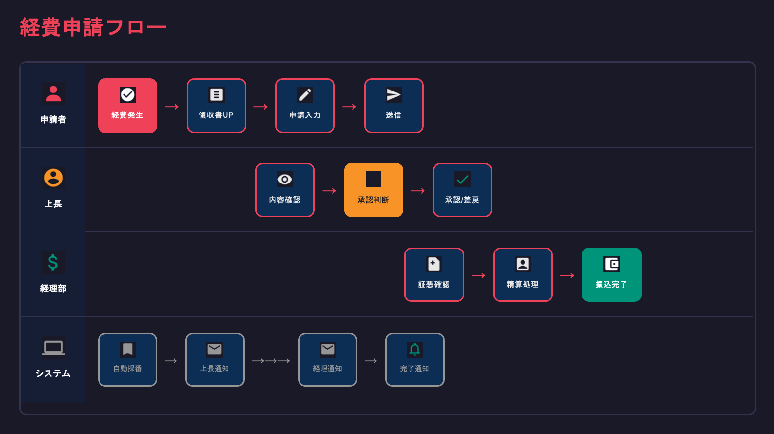 自動採番 → 上長通知 → 経理通知 → 完了通知
