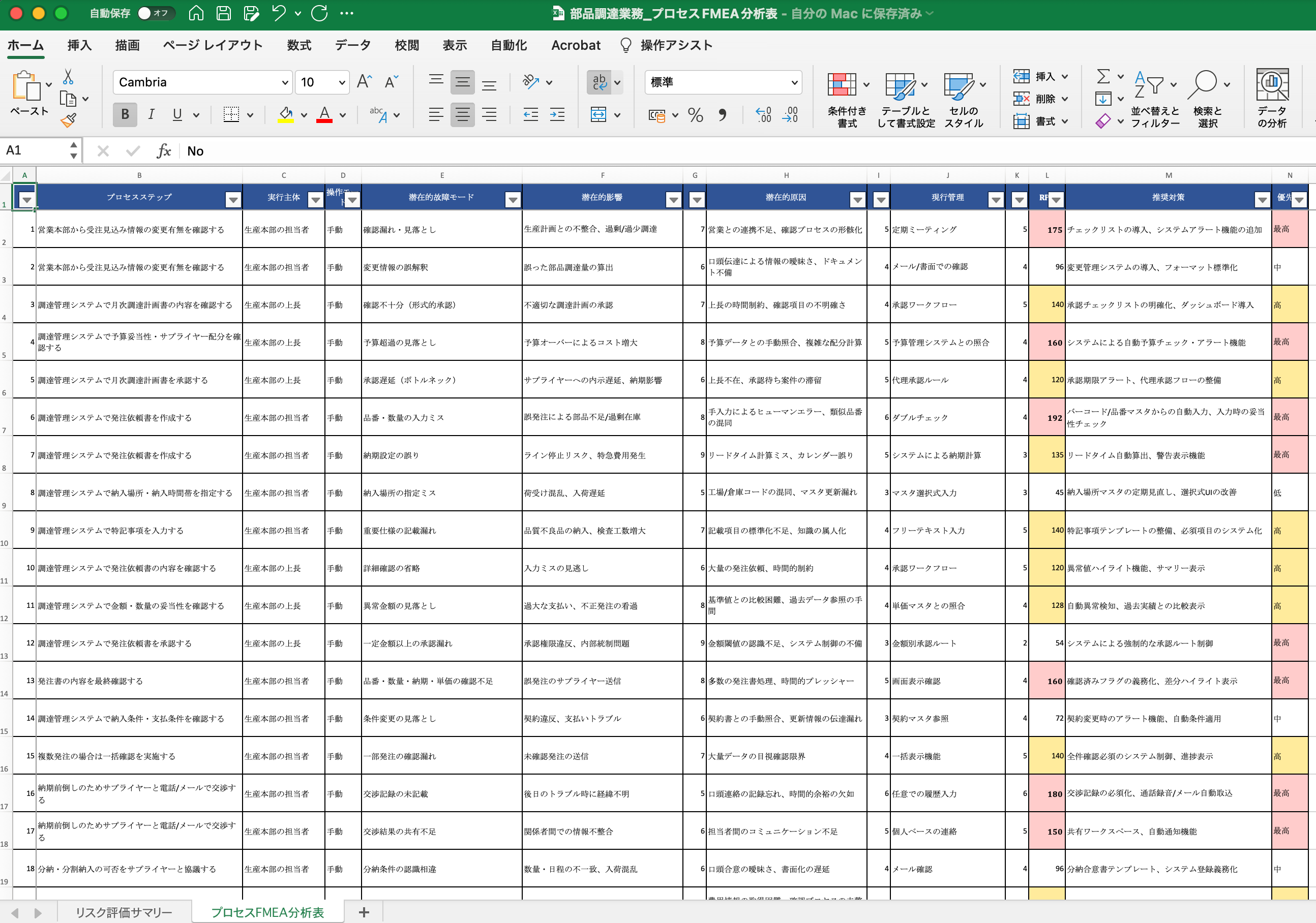 - プロセスFMEA分析表:全プロセスの故障モード、影響、S/O/D評価、RPN、推奨対策