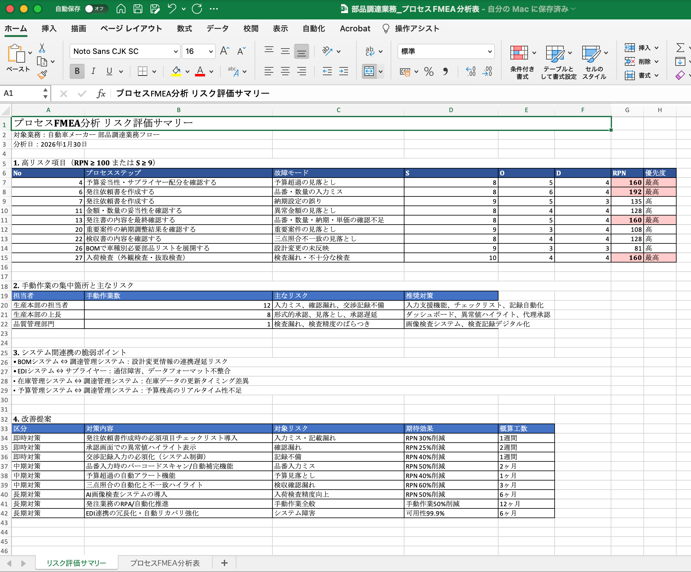 まず、リスク評価サマリーです。高リスク項目(RPN≧100またはS≧9)の一覧、手動作業が集中している箇所とその主なリスク、システム間連携の脆弱ポイント、そして即時・中期・長期に分類された改善提案が1シートにまとまっています。