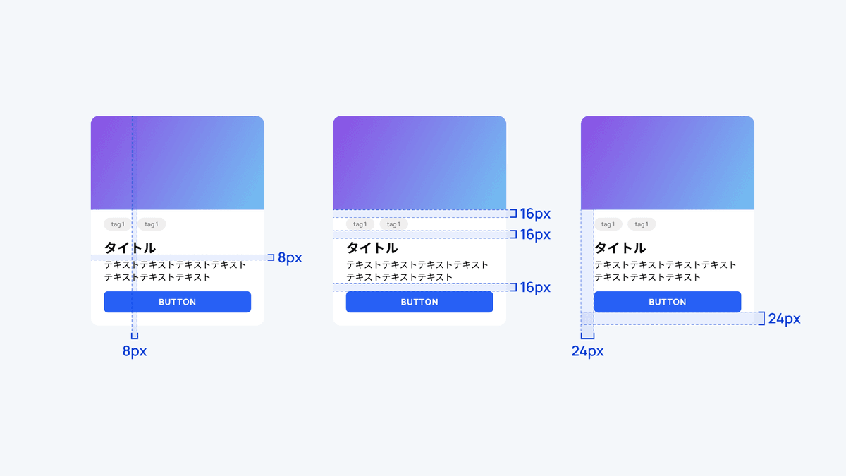 カード型コンポーネントでは、内側の余白や外側のマージンを8の倍数で設定することで、要素の詰まりを防ぎ、情報が視覚的に整理されます。 たとえば、カード内のテキストと画像の間隔を16px、カード内の要素とカードのフレームのパディングを24pxにすると、カード全体が統一感のあるデザインとなります。