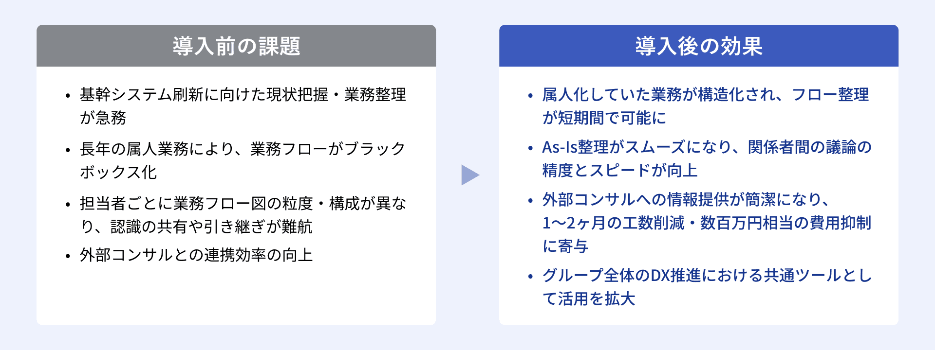 これまではその状況でもなんとか業務が回っていたため、目立った問題にはなっていませんでしたが、今回、基幹システムのリプレイスにあたり業務の可視化・整理をする必要が生じました。また、グループ全体のDX推進の観点からも、現状(As-Is)と理想(To-Be)を整理する必要がありました。