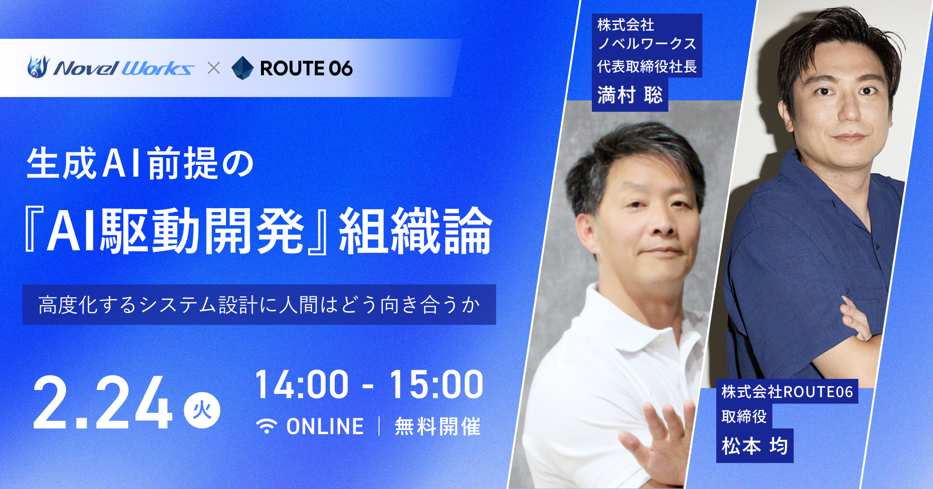 本セミナーでは、要件定義支援の最前線を担うROUTE06社と、ローコード×AI開発のノベルワークス社が登壇。 異なるアプローチを持つ現場出身の2名が、AIと人間の最適な役割分担や、これからの開発組織に求められる意思決定について徹底討論します。 SIビジネスの進化と、次世代のエンジニアリングの最適解を探る60分です。